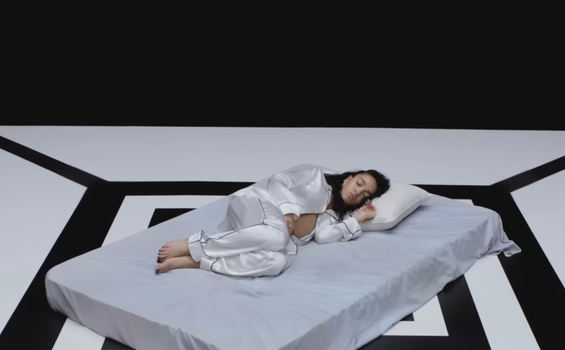 In Time opens with FKA twigs awaking on a mattress in a stark white room, pregnant— unexpectedly— and dressed in an all white silk pajama set.