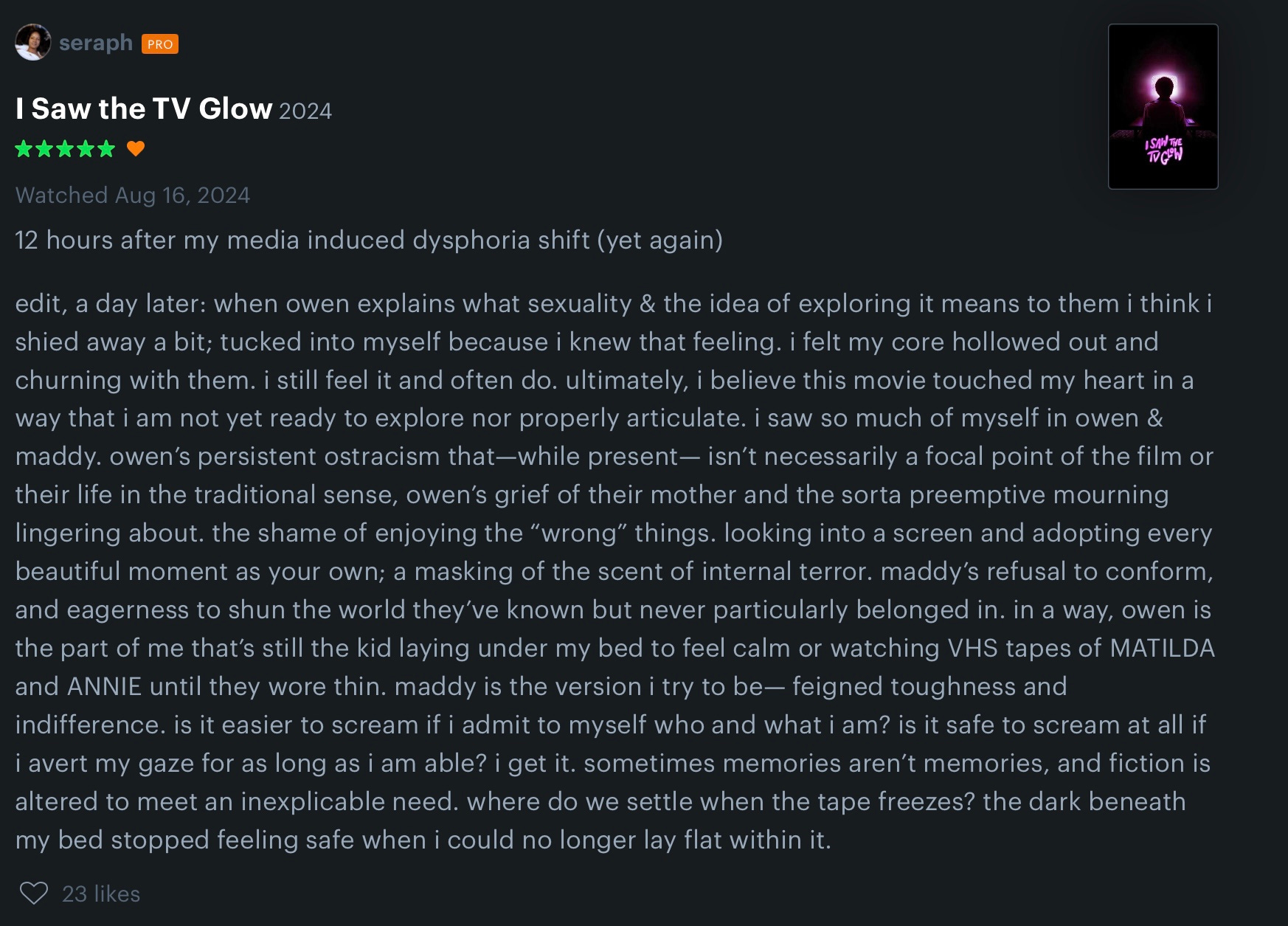 The closest I’ve been to adequately conveying how much this movie emotionally affected me is this frantic review on my Letterboxd account: